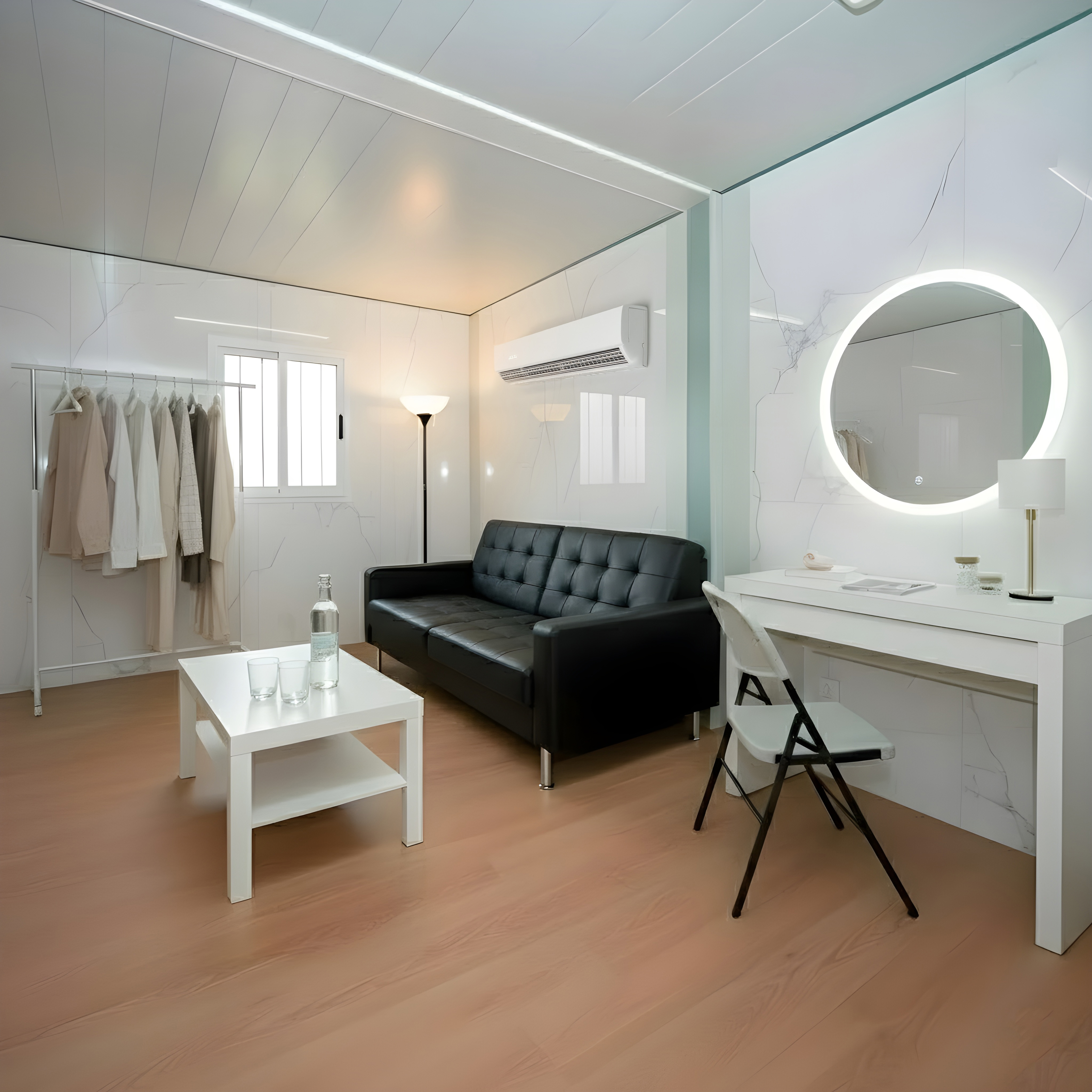 Módulo prefabricado premium versátil y funcional, diseñado para múltiples aplicaciones en eventos, conciertos, festivales, rodajes y producciones de cine. Combina un diseño elegante con acabados de alta calidad, e incluye suelo de parqué, sistema de climatización tipo split y opciones de personalización tanto interior como exterior.