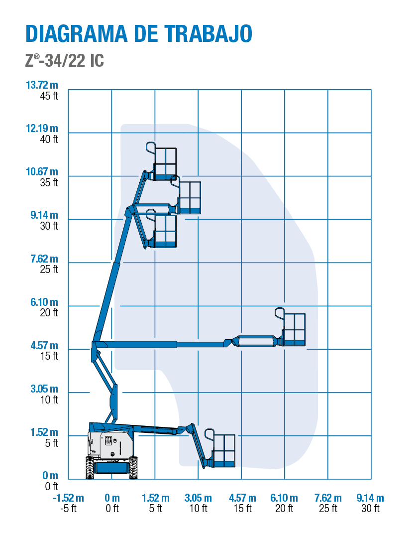 Plataforma articulada todoterreno diesel stv genie z34/22ic, 12,54m altura de trabajo y 6,78m alcance horizontal , 230kg capacidad de carga y maximo 2 personas en cesta, desnivel admisible 4.5º , anchura 1,85m y peso aproximado 5.000 kg en genie.