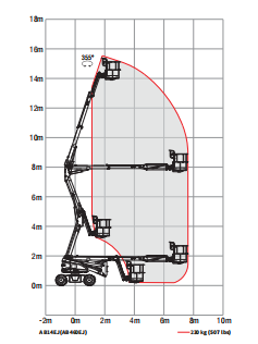 Plataforma articulada electrica todoterreno sinoboom ab14ej, 16m altura de trabajo y 7,6 m alcance horizontal, 230kg capacidad de carga y maximo 2 personas en cesta, desnivel admisible 5°, plumin articulado, ruedas no marking y sistema de seguridad en cesta, 1,73m anchura y peso 7300 kg.