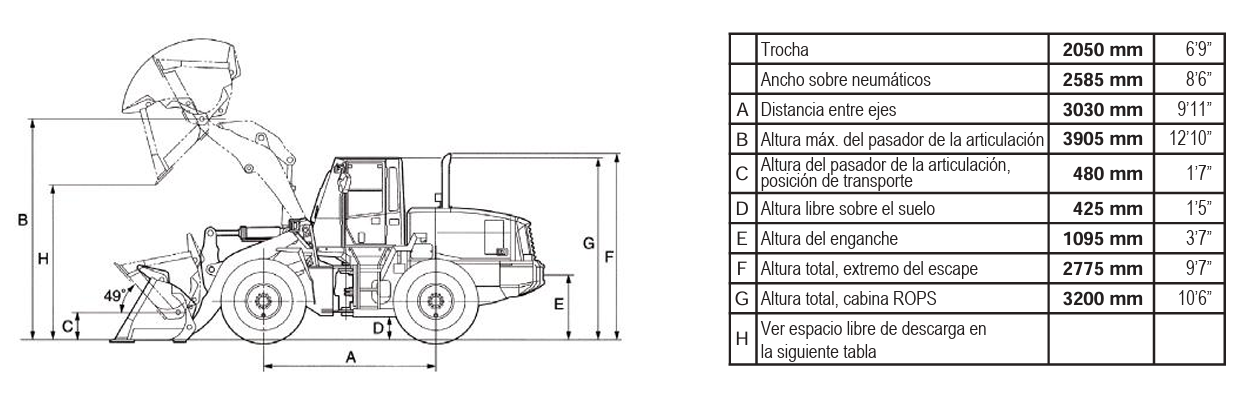 Pala cargadora articulada compacta de ruedas y chasis con eje oscilante con motor diesel (sin matriculacion no apta para circulacion vial), 2,7m3-4500kg capacidad nominal de carga, cabina cerrada con aire acondicionado rops/fops con excelente visibilidad y asiento ajustable, control de movimientos en joystick multifuncion, pedal de marcha lenta, linea auxiliar hidraulica 172,0l/min, se suministra con cucharon de ancho 2,74m, sistema de montaje estandar para implementos, longitud 7,77m, ancho 2,58m, altura 3.20m, luces de trabajo delanteras y espejos retrovisores, 6,37m radio de giro con cucharon y aprox. 15500kg peso