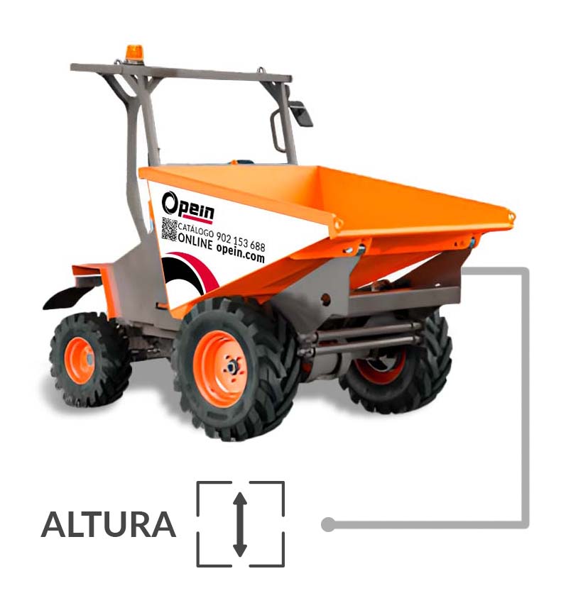 Dumper rigido con sistema de descarga en altura, transmision mecanica 4x2 y motor diesel, 1500kg capacidad nominal de carga, ancho 1,56m y longitud 2,55m y altura 2,09m, neumaticos con sistema antipinchazos, techo protector rops/fops, faro rotativo y avisador acustivo de marcha atras, 25% pendiente superable, matriculacion y alumbrado segun codigo de circulacion, luces de trabajo delanteras y espejos retrovisores, 3,47m radio de giro y 1360kg peso
