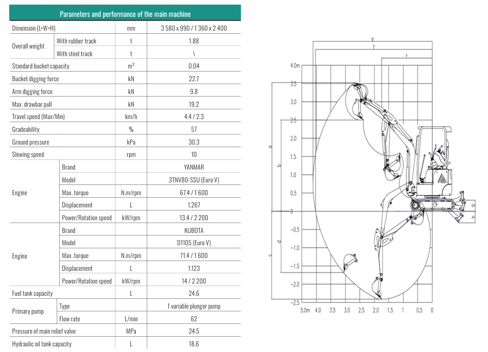 Miniexcavadora sunward compacta de 1,8t con giro de voladizo cero y motor diesel, tren de rodaje extensible 990-1320mm con orugas de caucho, longitud de transporte 3,58m y altura 2,41m, profundidad de excavacion 2200mm, bastidor de proteccion rops con canopy, gancho de izado, enchufes hidraulicos rapidos de cara plana para implemento, se suministra sin cazo ni martillo hidraulico, radio de grio delantero/trasero 1535/680mm, luces de trabajo y 1880kg peso.