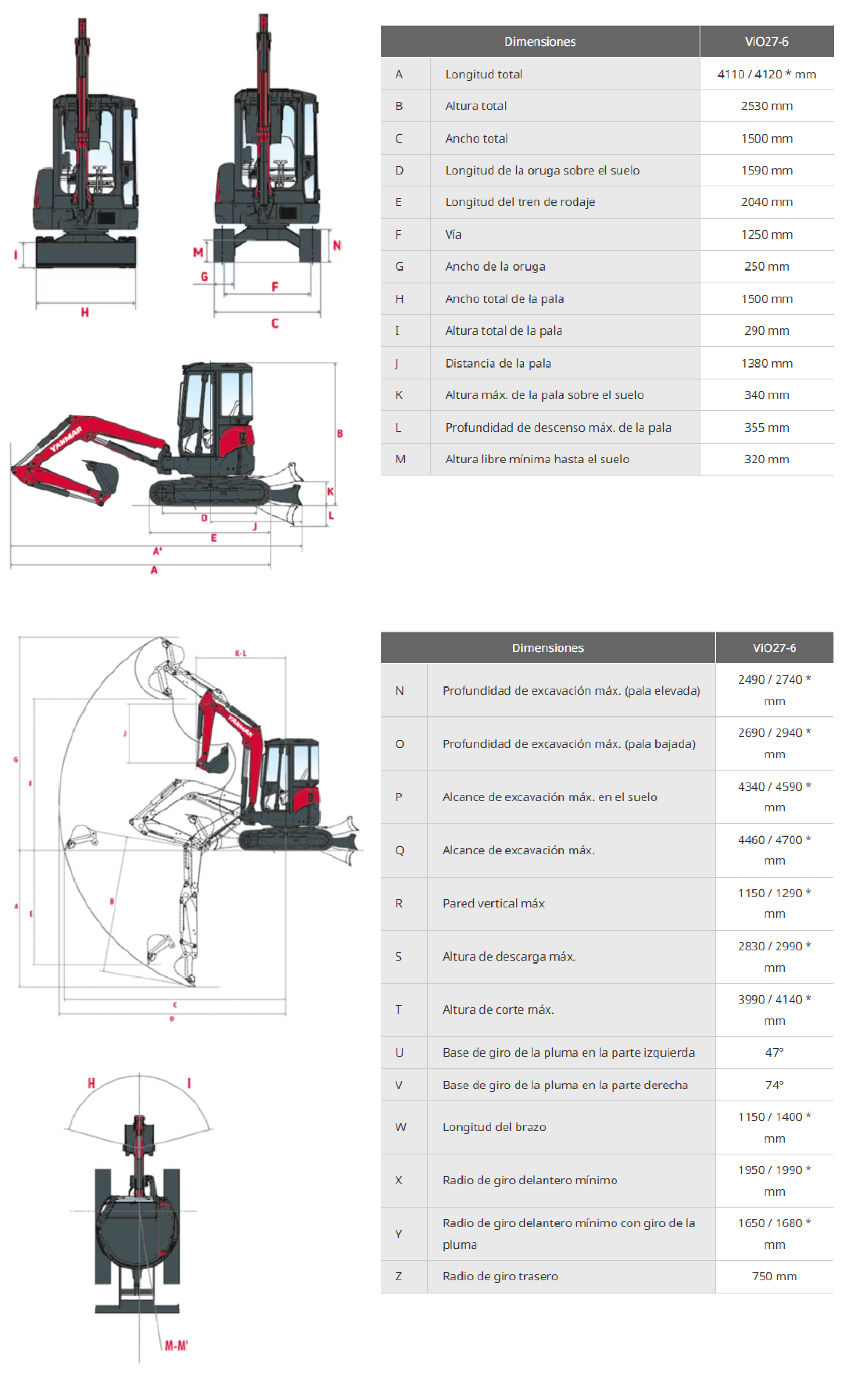 Miniexcavadora yanmar compacta de 2,7t con giro de voladizo cero y motor diesel stv, tren de rodaje 1500mm con orugas de caucho, longitud de transporte 4,11m y altura 2,53m, enchufes hidraulicos rapidos de cara plana para implemento, con acople rapido mecanico, se suministra sin cazo ni martillo hidraulico, luces de trabajo y 2770kg peso.